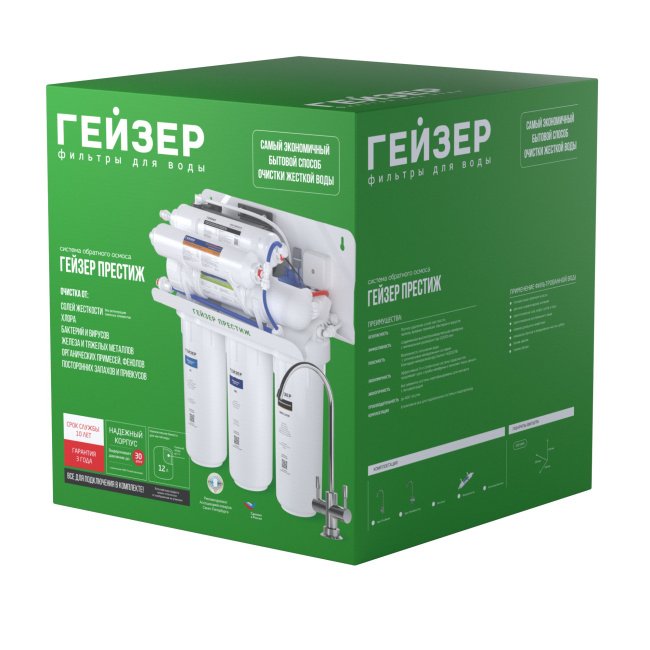 Технология обратного осмоса, использованная в фильтре Гейзер Престиж, заключается в фильтрации воды через полупроницаемую мембрану. Размеры пор мембраны настолько малы, что пропускают только молекулы воды. Размер молекул большинства примесей, а также бактерий и вирусов значительно больше молекул входящее в комплект, повысит уровень давления до 3-6 атм.