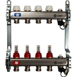Коллектор из нержавеющей стали с расходомерами, с клапаном вып. воздуха и сливом 4 вых STOUT в Ханты-Мансийске