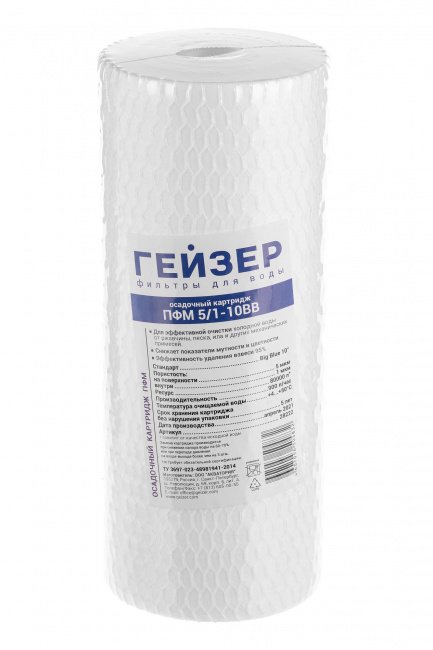 Картридж ПФМ-Г 1/0,5 10BB предназначен для очистки горячей воды от нерастворимых примесей. В отличие от PP обладают градиентной пористостью: диаметр поры уменьшается при движении воды внутрь картриджа, позволяя работать всему объему фильтрующего материала. У картриджей есть модификации для горячей воды. Не восстанавливаются и не регенерируется.