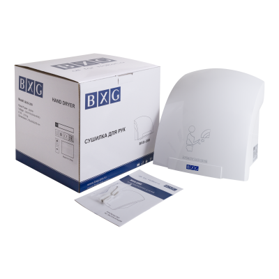 BXG-200 - мощная и надежная сушилка для рук. Сушилка оснащена сенсорным датчиком, что обеспечивает автоматическое включение и отключение аппарата. Сушилка оснащена функцией автоматического отключения для экономии электроэнергии. В случае постоянного нахождения посторонних предметов в зоне срабатывания датчика устройство отключается через 60 секунд. Так же прибор оснащён функцией защиты от перегрева - температура срабатывания защитного отключения 105 °С.